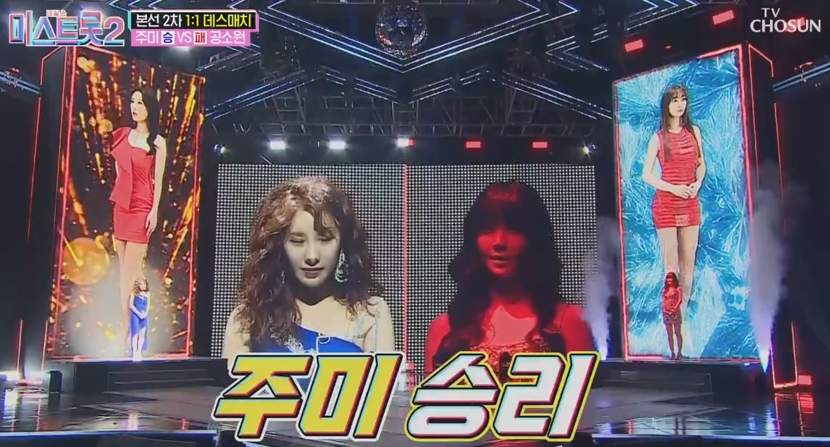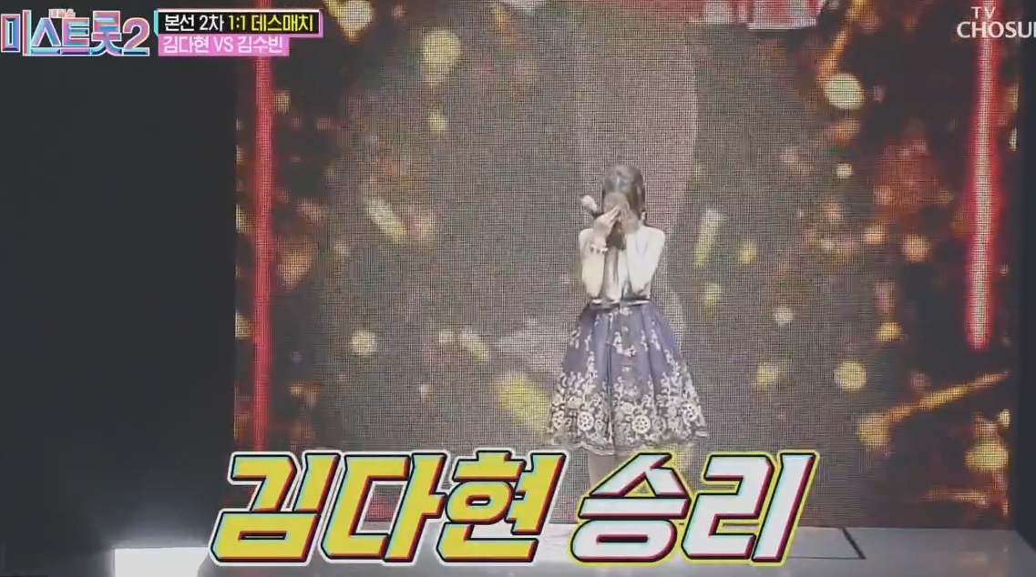 다섯 번째 데스매치는 주미오 공소원이 각각 '안되나요' 와 '하이난 사랑'을 선곡하며 맞붙었습니다. 주미의 코믹댄스와 퍼포먼스 가득한 무대를 보여주며 9대 2로 승리했습니다. 여섯 번째 데스매치는 김다현과 김수빈의 절친 매치 대결이었는데요. 9대 2로 김다현이 승리를 했습니다.