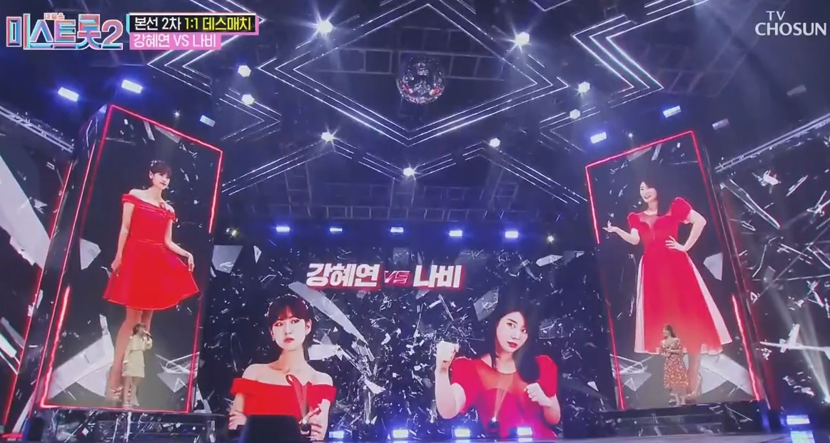 첫 번째 데스매치 경기는 강혜연 과 나비 입니다. 강혜연이 "이제 몸도 무거우실 텐데 집에서 편하게 미스트롯2 보시면서 트둥이 태교에 전념하세요" 라며 도발했습니다. 강혜연 은 '김지애 - 물레야' 를 선곡하여 깜찍한 댄스와 함께 열창했습니다. 이어서 나비는 '김수희 - 못 잊겠어요' 를 선곡하여 애절하게 부르며 마스터들을 흡족하게 했습니다.