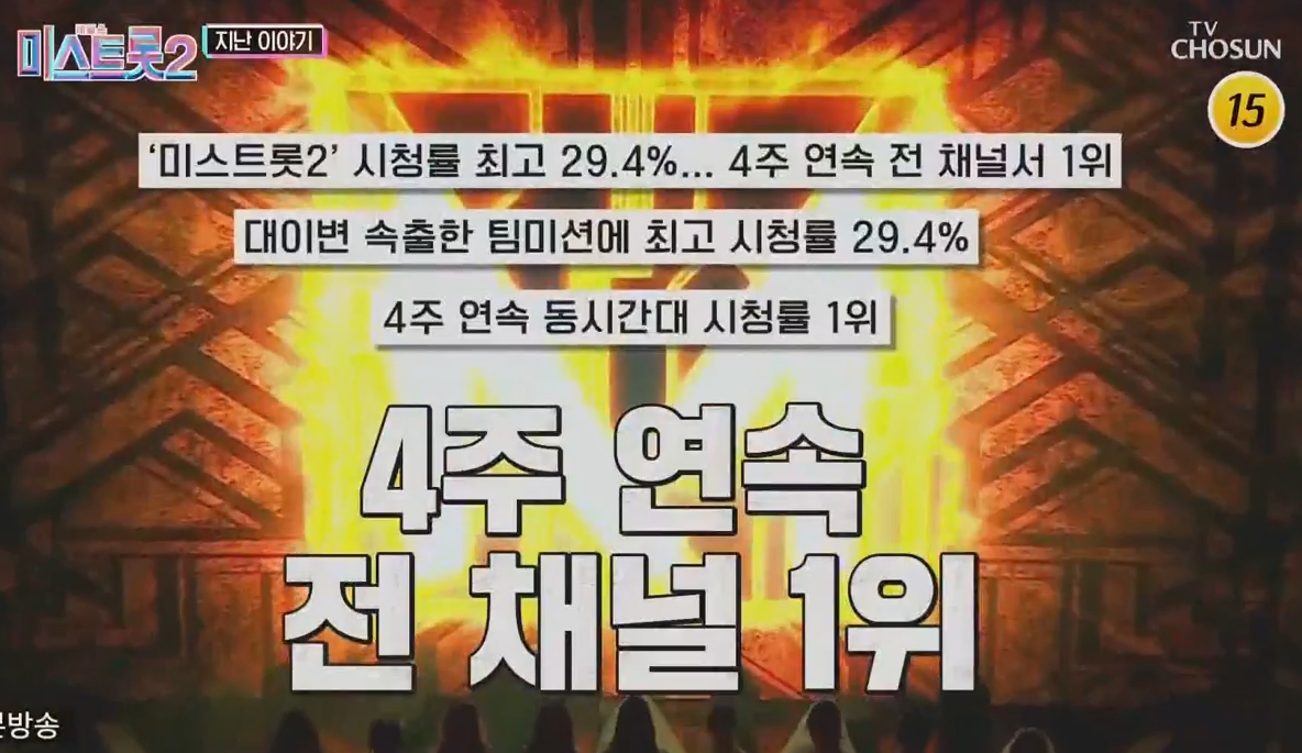 미스트롯2 5회가 1월 14일 저녁 10시에 방영되었습니다. 순간 최고 시청률이 무려 31.4% 전국 29.8%의 시청률을 기록하며 미스트롯2 자체 최고 기록을 경신했습니다. 5주 연속 지상파와 비지상파를 포함한 전 채널 주간 예능을 올킬하며 또다시 트로트 오디션 원조의 위엄을 보여줬습니다.
