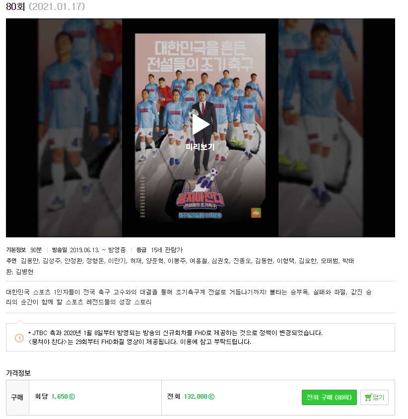 네이버 시리즈온에서 뭉쳐야 찬다 다시보기 가능하며 회당 1,650원을 내고 다시보기 가능합니다. 구매하시면 7일 동안 무제한으로 다시보기 가능하며, 29회부터 FHD 영상이 제공된다고 합니다.