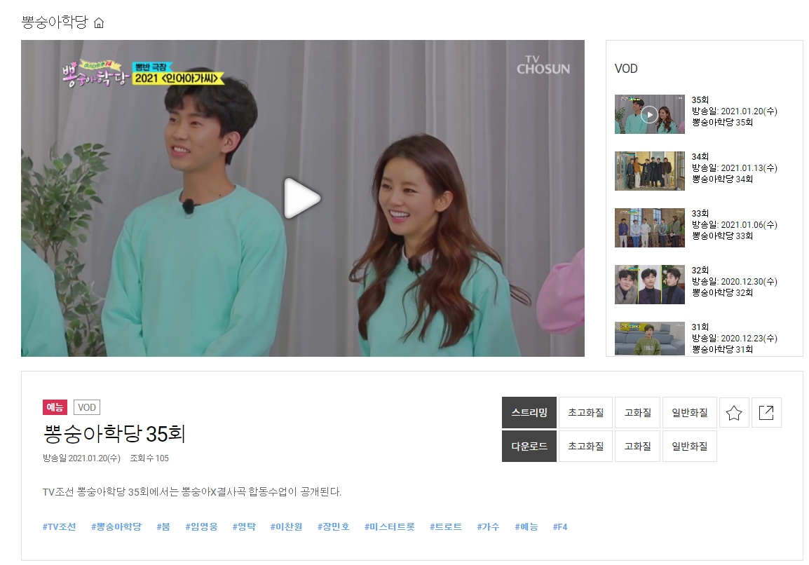 TV조선 온에어를 이용하시면 뽕숭아학당 무료 다시보기 하실 수 있습니다. 아래 포스트에 접속하시면 TV조선 온에어 무료 사용방법 및 스마트폰 등 휴대용기기에서 무료 감상 방법이 자세하게 나와있으니 참고하시면 됩니다.