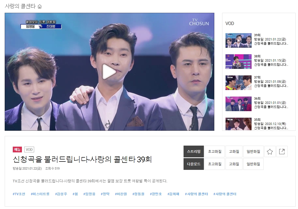 티브이조선 홈페이지 바로가기 에서 사랑의 콜센터 39회 재방송 다시보기 가능합니다. 스트리밍//다운로드 두 가지 방법 중 선택해서 다시보기 할 수 있으며, 화질별로 스트리밍 및 다시보기 가능합니다.