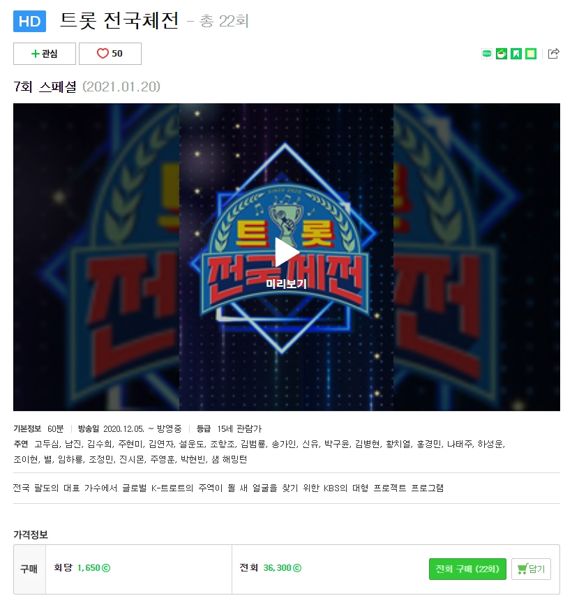 네이버 시리즈온 홈페이지 바로가기 에서 트롯 전국체전 재방송 다시보기 하실 수 있습니다. 회당 1,650원으로 재방송 다시보기 하실 수 있으며, 구매 후 7일동안 무제한으로 다시보기 가능합니다.