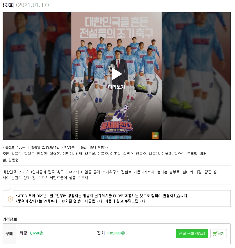 네이버 시리즈온 에서 뭉쳐야 찬다 재방송 다시보기 하실 수 있습니다. 한 회당 1,650원 이며 구매 후 7일동안 무제한 다시보기 하실 수 있습니다. 29회부터 FHD 화질 영상이 제공된다고 하니 참고하시길 바랍니다.