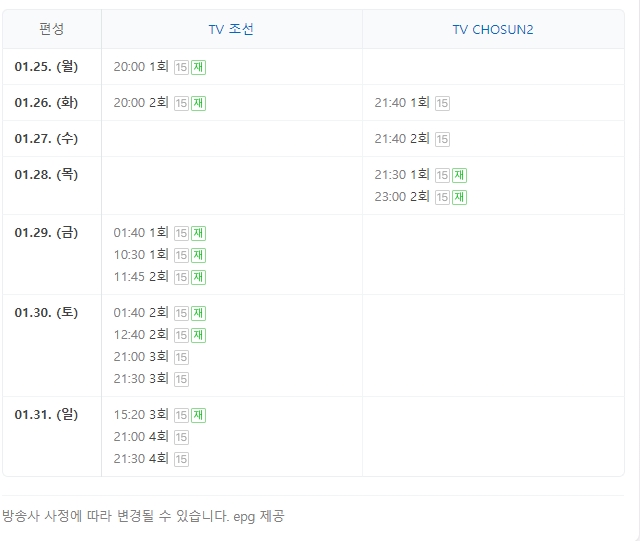 방송시간 : 티브이조선 2021년 01월 23일 ~ (토,일) 오후 09:00