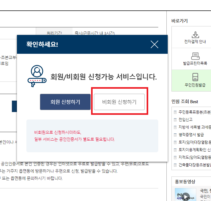 신청하기 버튼을 누르면 작은 팝업창으로 회원/비회원 신청이 가능합니다. 회원가입하기 귀찮으니 우리는 비회원으로 신청해봅시다.