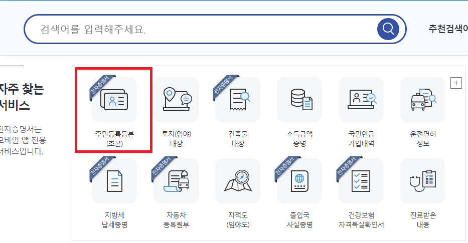 이렇게 접속하시면 아래쪽에 주민등록등본(초본)란이 있습니다. 클릭해줍시다.