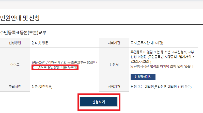클릭하면 민원안내 및 신청화면이 나옵니다. 주민센터에가면 수수료가 1통에 400원, 이해관계인의 등초본교부는 500원이라고 되어있네요.