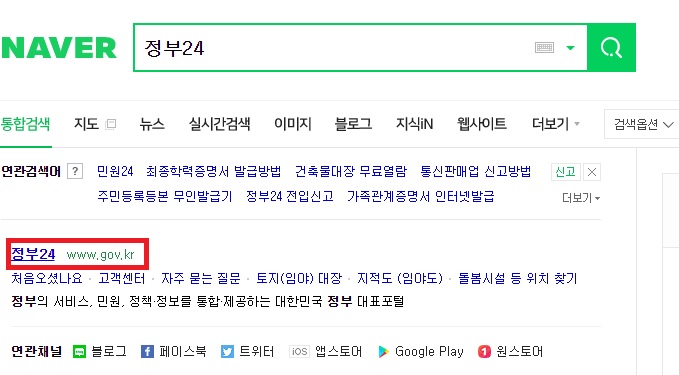 먼저 검색창에 정부24를 검색하거나, 정부24홈페이지(http://www.gov.kr/portal/main)에 접속합니다.