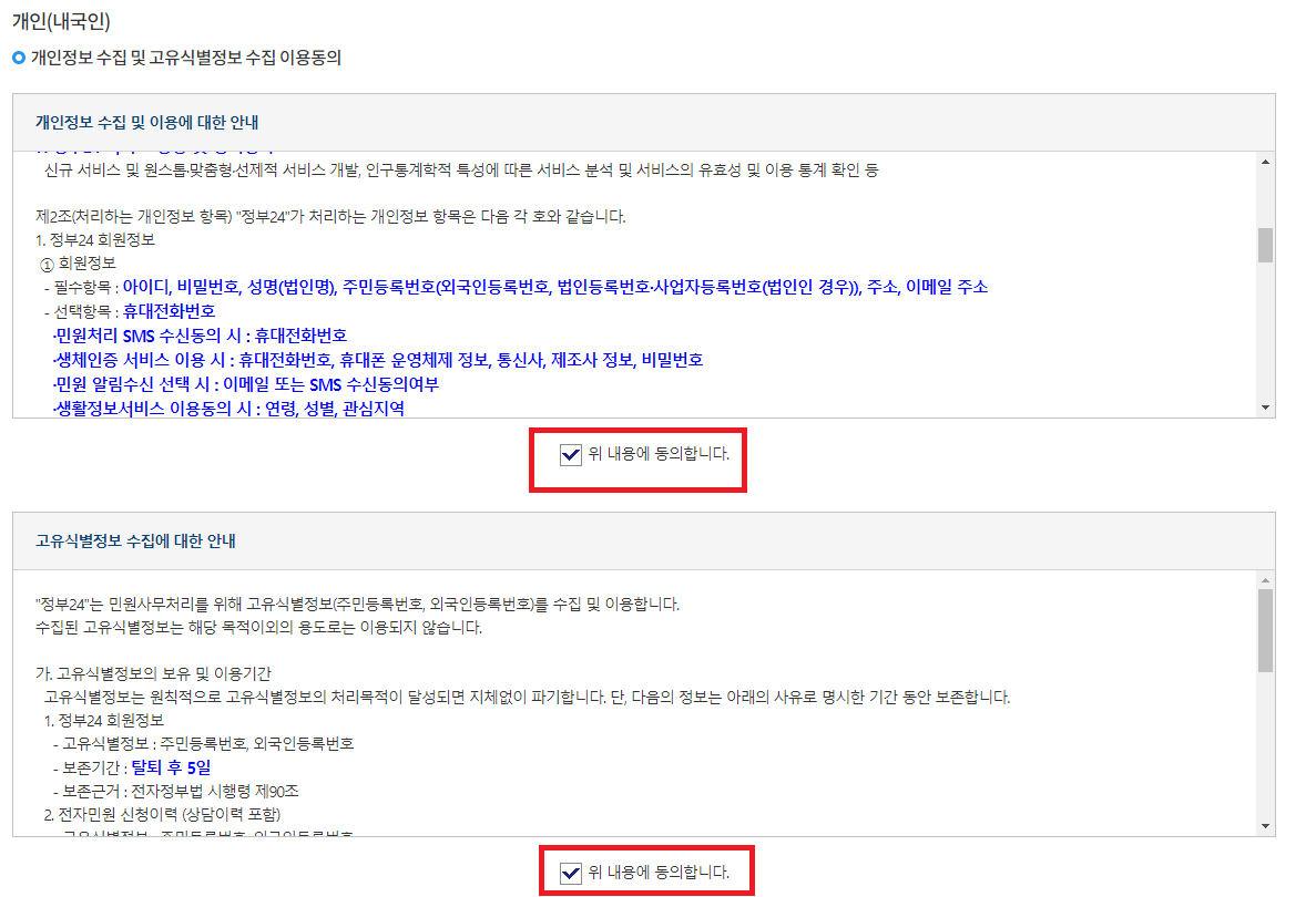 그 다음은 우린 개인이고 내국인이니, 개인수집 및 고유식별정보 수집에 관한 약관에 동의를 해줍시다.