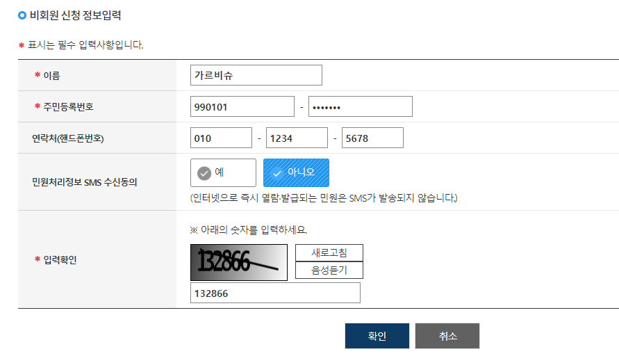 그리고 비회원 신청 정보를 입력합시다. 이름 주민등록번호 입력확인 필수 입력사항만 입력해주시면 됩니다.