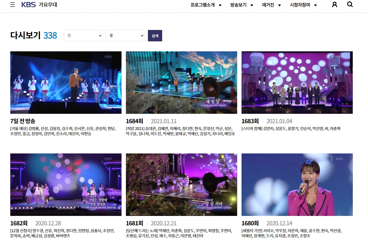 KBS 가요무대 홈페이지 에서는 무료로 다시보기 제공하고 있습니다. 원하시는 회차를 선택 후 클릭하시면 되는데요, 회차 아래 출연진들도 나와있으니 잘 보시고 무료로 다시보기 하시면 됩니다.