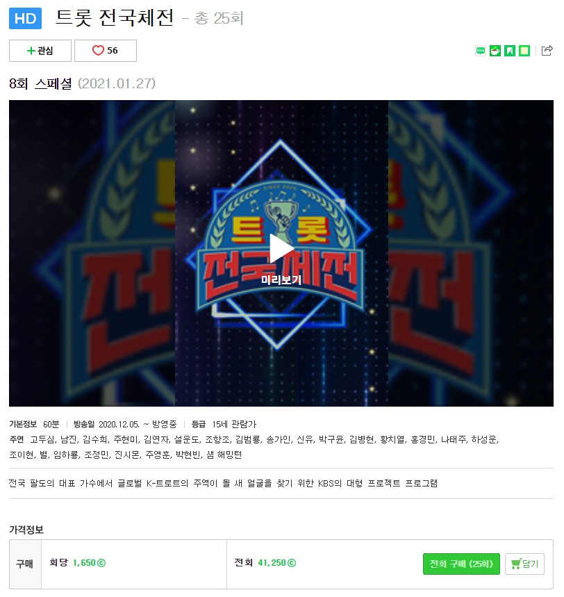 네이버 시리즈온 홈페이지 바로가기 에서 트롯 전국체전 재방송을 다시보기 하실 수 있습니다. 회당 1,650원으로 재방송 다시보기 하실 수 있으며, 구매 후 7일동안 무제한으로 다시보기 가능합니다.