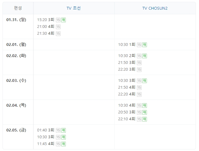 방송시간 : 티브이조선 2021년 01월 23일 ~ (토,일) 오후 09:00