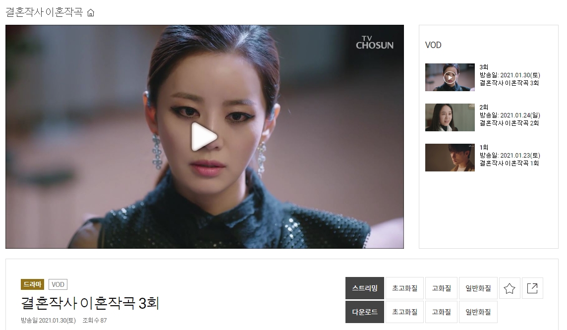 티비조선 홈페이지 바로가기 에서 결혼작사 이혼작곡 회차별로 재방송 다시보기 가능합니다. 스트리밍 다운로드 두 가지 중 한 가지 선택해서 다시보기 하실 수 있으며, 화질별로 스트리밍 및 다운로드 재방송 다시보기 가능합니다.