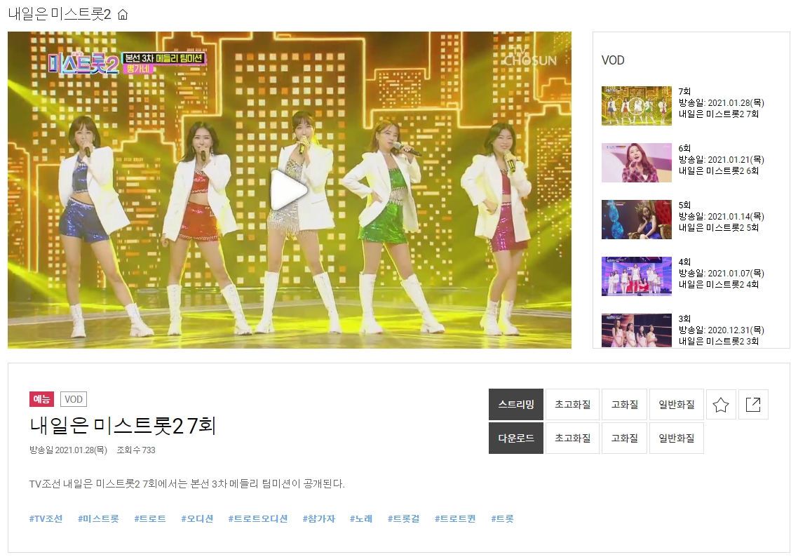 TV조선 홈페이지 미스트롯2 재방송 다시보기