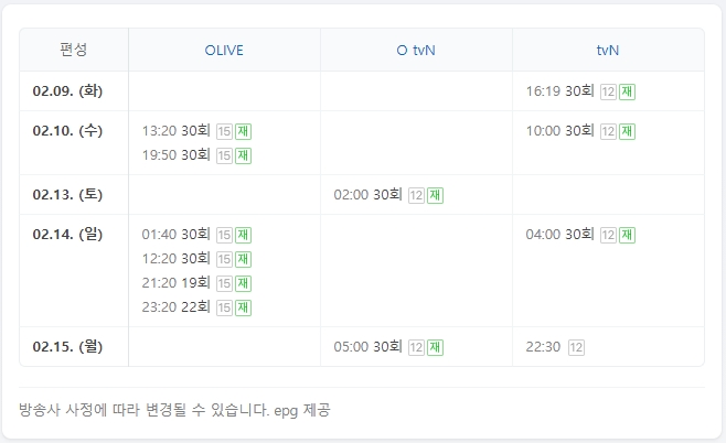 일요일 OLIVE 01:40, 12:20 // tvN 04:00