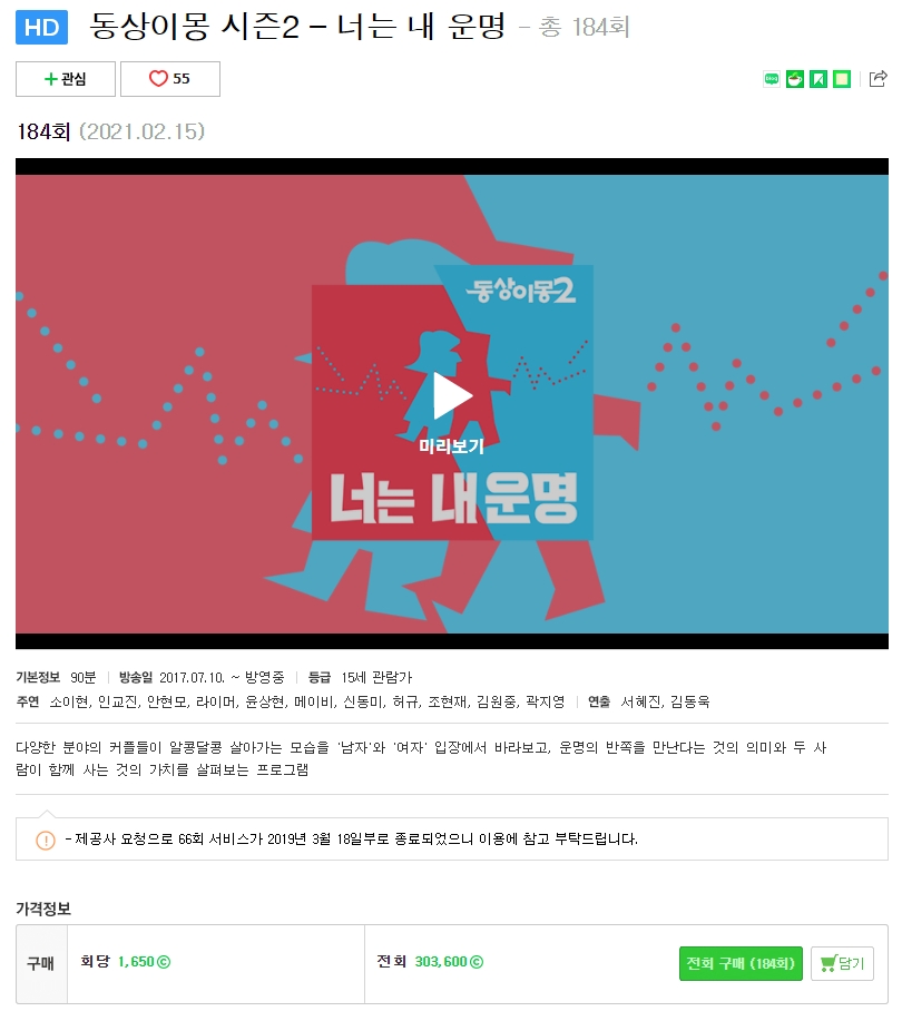 네이버 시리즈온 동상이몽 시즌2 - 너는 내 운명 바로가기 하시면 회 당 1,650원에 구매 가능합니다. 대여기간은 7일이며, SBS 홈페이지 24시간이 짧다고 생각되시는 분은 네이버 시리즈온 에서 결제하시면 여유롭게 재방송 다시보기 하실 수 있습니다.