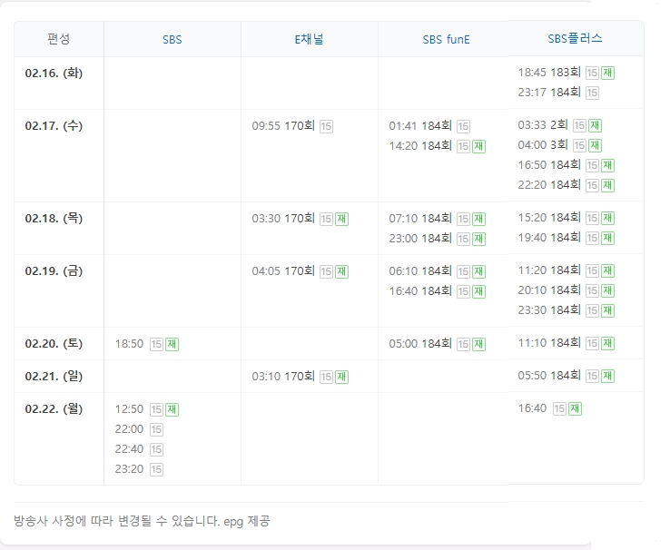 수요일 SBS funE 01:41, 14:20 // SBS플러스 16:50, 22:20