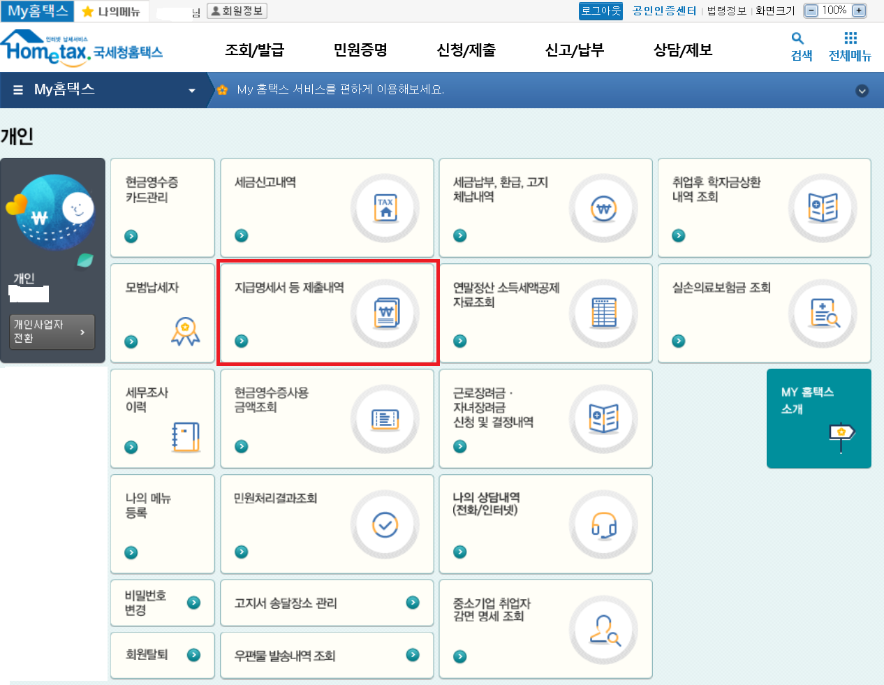 이 많은것들 중에 원천징수영수증 발급은 지급명세서 등 제출내역을 클릭해서 들어가줍니다.