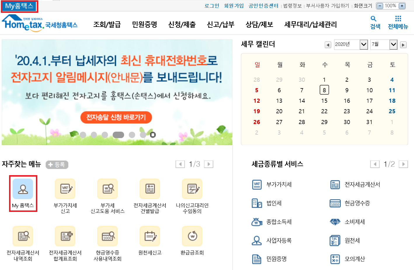 그럼 아래와 같은 홈택스 메인화면이 뜹니다. 먼저 로그인을 해주셔야 됩니다. 공인인증서로 로그인해주시고 회원가입이 안되어 있으시다면 이 번에 가입하시는걸 추천합니다. 로그인하시고 My홈택스를 클릭하시면 됩니다. My홈택스는 좌측상단이나 자주찾는 메뉴에 있으니 아무거나 클릭하시면 됩니다.