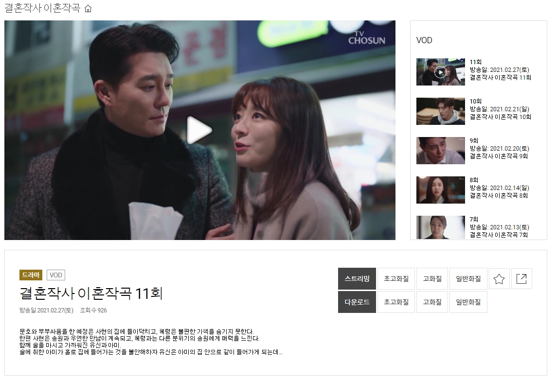 티브이조선 홈페이지 바로가기 에서 결혼작사 이혼작곡 회차별로 재방송 다시보기 가능합니다. 스트르밍 다운로드 두 가지 중 한 가지 선택해서 다시보기 하실 수 있으며, 화질별로 스트리밍 및 다운로드 재방송 다시보기 가능합니다.