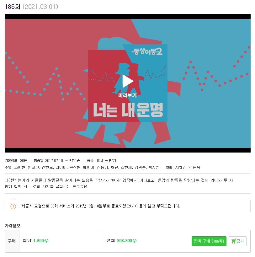 네이버 시리즈온 동상이몽 시즌2 - 너는 내 운명 바로가기 하시면 회 당 1,650원에 구매 가능합니다. 대여기간은 7일이며, SBS 홈페이지 24시간이 짧다고 생각되시는 분은 네이버 시리즈온 에서 결제하시면 여유롭게 재방송 다시보기 하실 수 있습니다.
