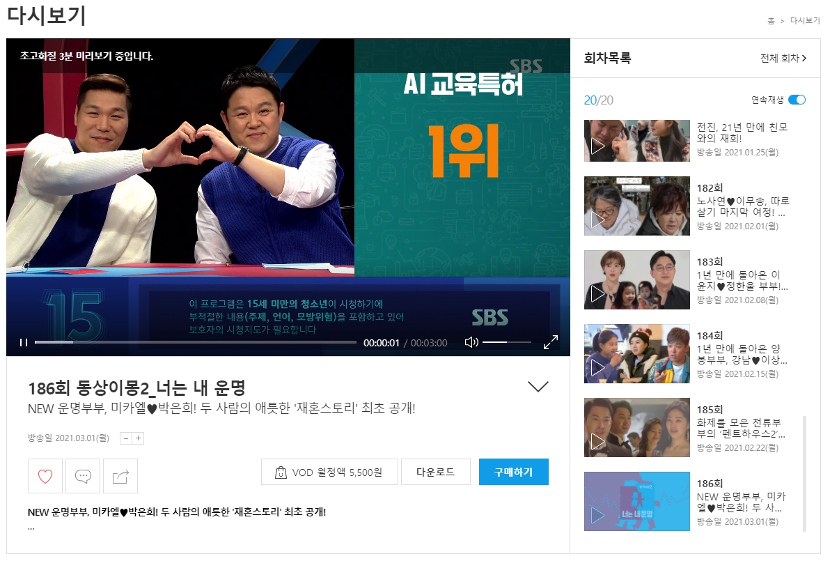 1) SBS 홈페이지 동상이몽2 - 너는 내 운명 재방송 다시보기