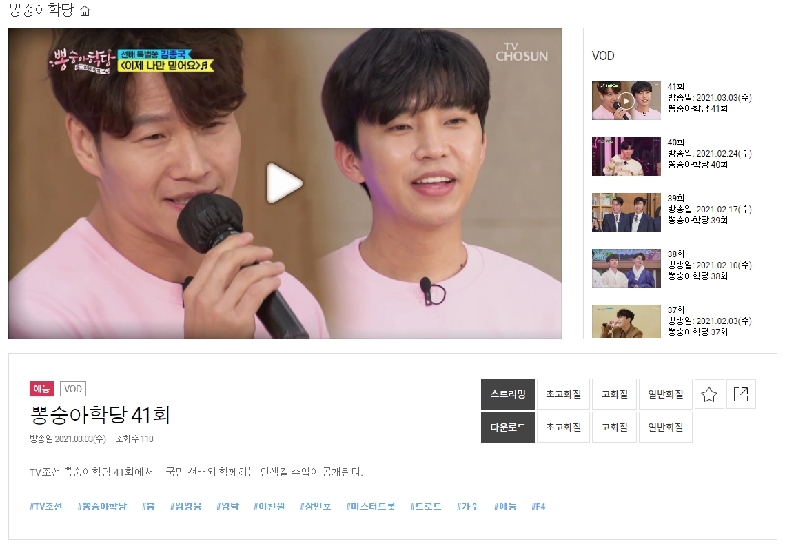 1) TV조선 홈페이지 뽕숭아학당 다시보기