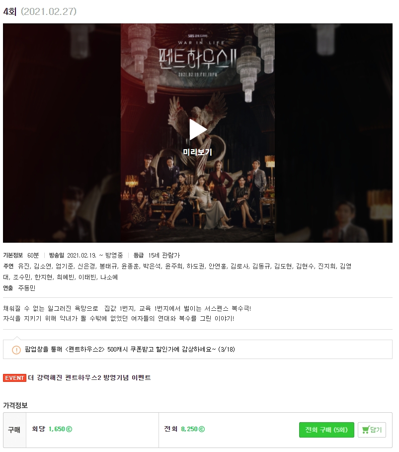 에스비에스 홈페이지 바로가기 에서 펜트하우스2 1회 재방송 다시보기 가능합니다. VOD 월정액 5,500원으로 보실 수 있으며, 월정액 최초 구매시 첫 달 1,000원 이벤트를 진행 중입니다. PAYCO // 카카오PAY 로 결제시 첫 달은 무료로 이용가능하니 참고하시길 바랍니다.