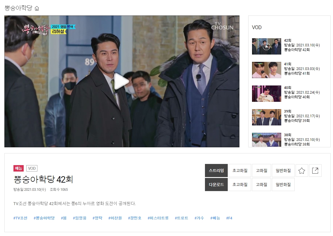 티브이조선 온에어 서비스를 이용하시면 뽕숭아학당 무료 다시보기 하실 수 있습니다. 아래 포스트에 접속하시면 티브이조선 온에어 무료 사용방법 및 스마트폰 휴대용기기에서 무료 감상 방법이 자세하게 나와있으니 참고하시면 됩니다.