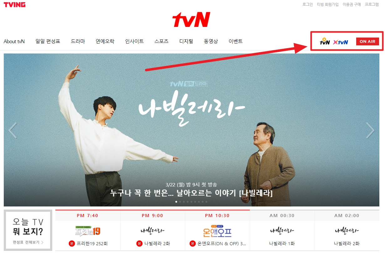 TVN TVING 온에어 서비스를 이용하시면 나빌레라 재방송 다시보기 무료로 가능합니다. 컴퓨터 뿐만 아니라 스마트기기로도 재방송 시간에 맞춰 접속하시면 시청이 가능한데요, 결제가 부담스러우시면 온에어 서비스를 이용하시면 됩니다.