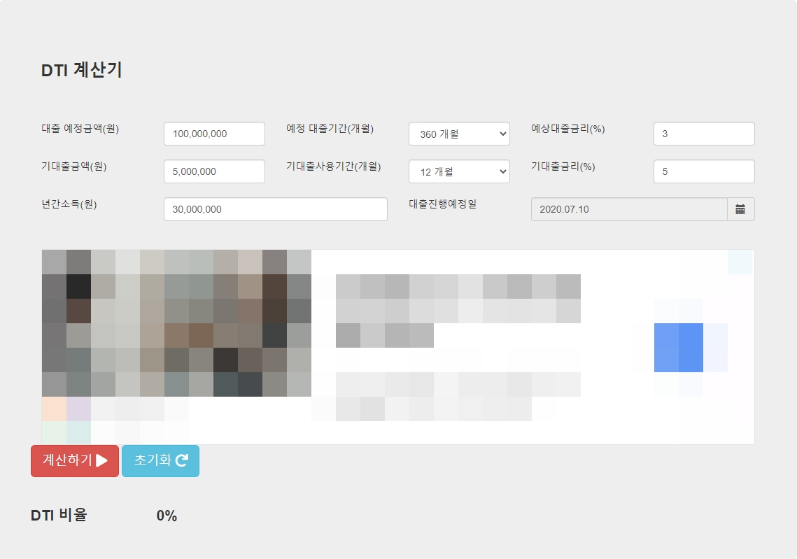위 표대로 설정한 후 DTI 계산기를 사용해 보았습니다.