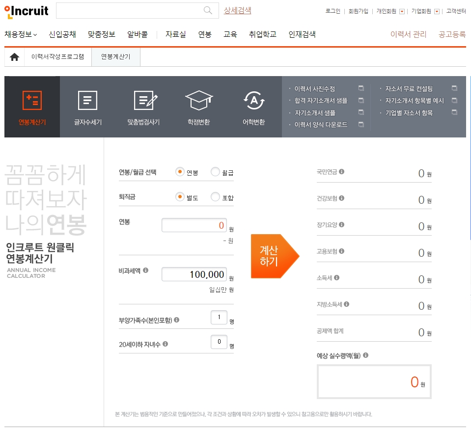 인터넷 검색창에 연봉계산기라고 검색하시면 네이버에서 제공 하는 연봉계산기를 사용하셔도 되고, 저는 인크루트 연봉계산기가 편해서 인크루트 연봉계산기를 사용합니다. 인크루트 연봉계산기 라고 검색하시거나 인크루트 홈페이지 (https://www.incruit.com/tools/salary/)에 바로 접속하셔서 사용하셔도 됩니다.