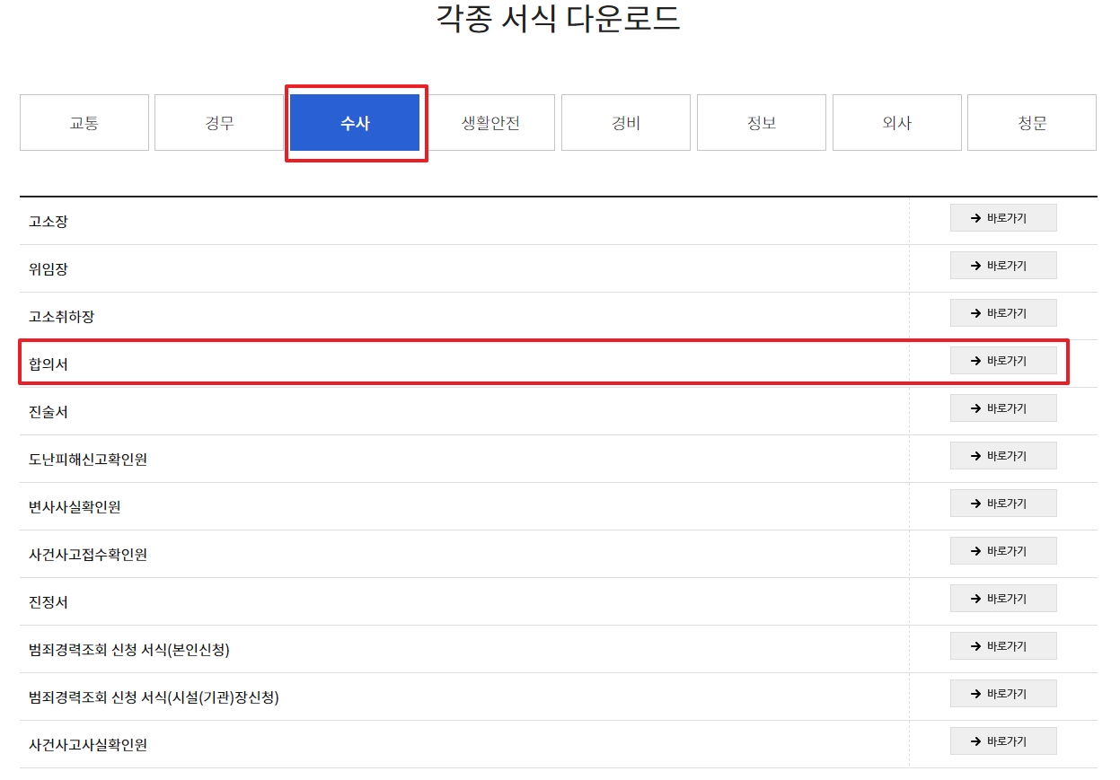 서울지방경찰청 각종서식다운로드 페이지에는 교통, 경무, 수사, 생활안전, 경비, 정보, 외사, 청문 등 다양한 행정에 필요한 서식들을 분류해 두었습니다. 합의서 양식의 경우에는 수사탭을 클릭 하시면 됩니다.