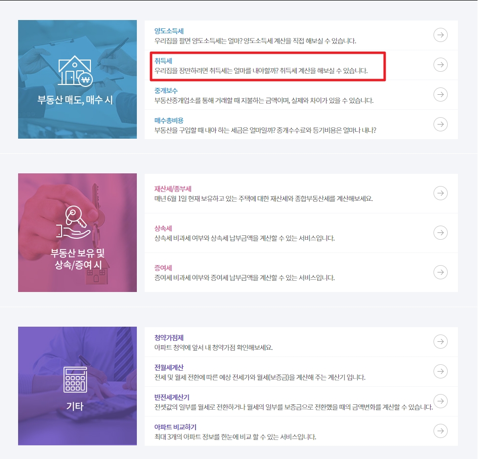 접속하시면, 아파트취등록세 계산 뿐만 아니라 부동산 매도, 매수 시에 필요한 세금계산, 부동산 보유 및 상속/증여 시에 필요한 계산, 청약가점제나 전세관련 계산기도 제공합니다. 우리가 찾는건 아파트취등록세 계산 방법 이니 빨간색 테두리된 부분을 클릭해주시면 됩니다.