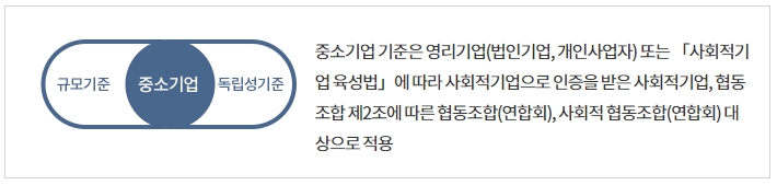 중소기업 기준은 영리기업(법인기업, 개인사업자)또는 '사회적기업 육성법' 에 따라 사회적기업으로 인증을 받은 사회적기업, 협동조합 제 2조에 따른 협동조합(연합회), 사회적 협동조합(연합회) 대상으로 적용하며, 규모기준과 독립성기준을 모두 충족해야 중소기업에 해당됩니다.