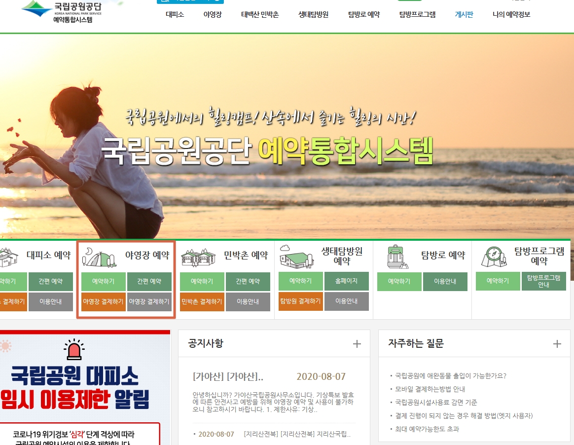 국립공원관리공단 예약통합시스템 야영장 예약하기