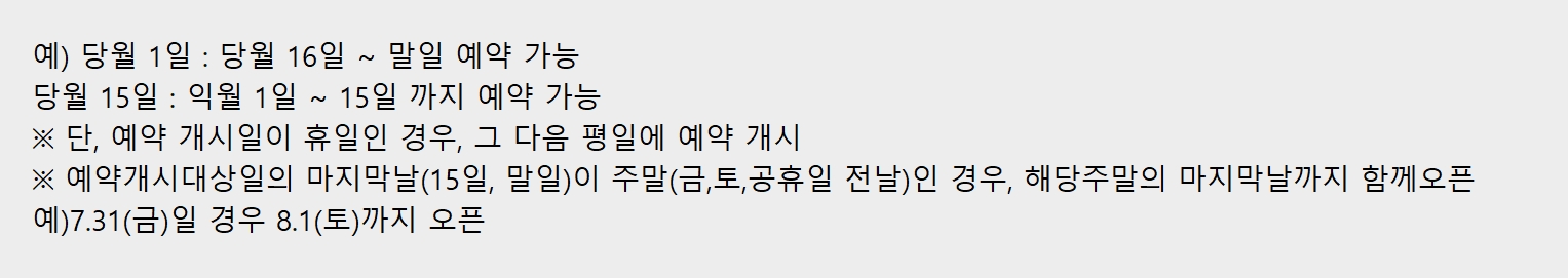 - 매월 2회(1일,15일) 15일 단위로 오후 2시에 예약일 오픈