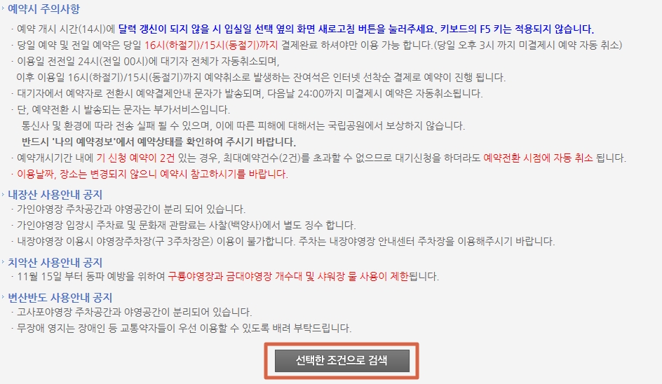 3) [숙박기간 및 숙박날짜] - [국립공원선택] - [야영장선택] - [시설선택] - [선택한 조건으로 검색]