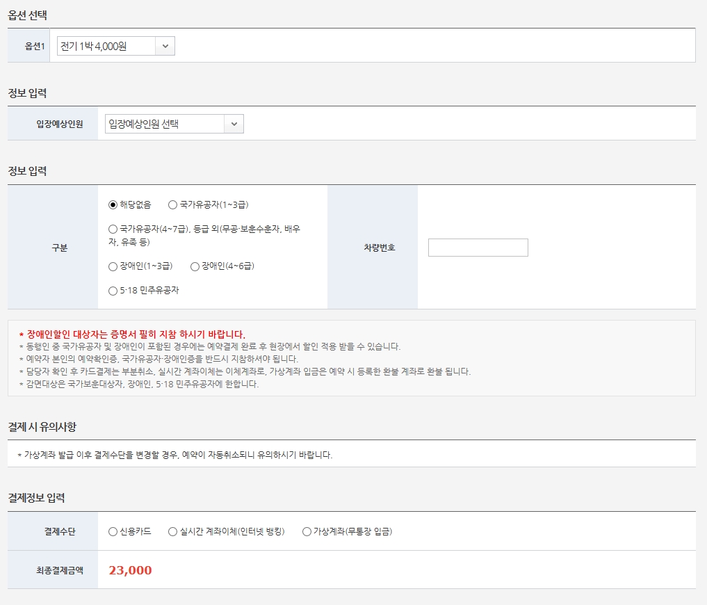 - 당일 예약 및 전일 예약은 당일 15시(동절기)/16시(하절기)까지 결제 가능