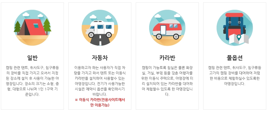야영장에는 4개의 타입으로 예약이 가능합니다.