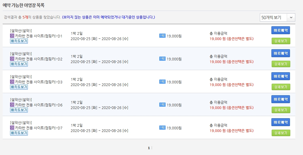 4) 8월29일에는 예약이 안돼서 8월 25일로 변경하여 검색하였습니다. [원하는 사이트 선택 후 바로예약]