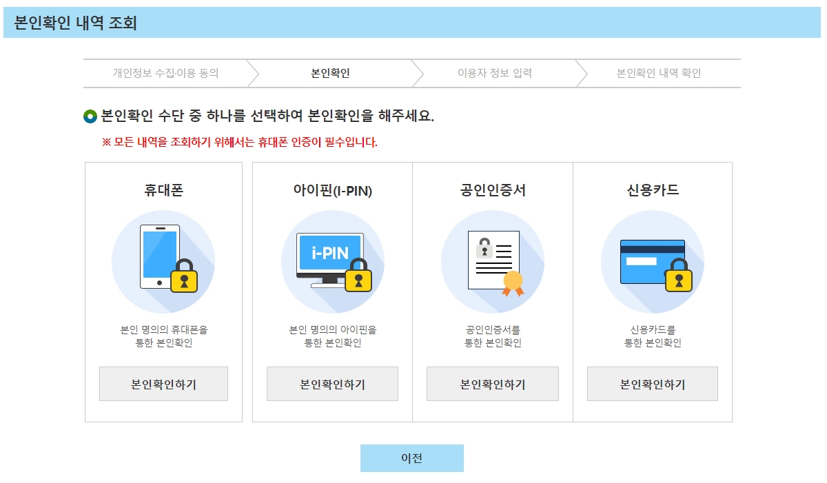 5. 본인확인 내역 조회를 위한 이용자 정보 입력하고 다음으로 넘어가기