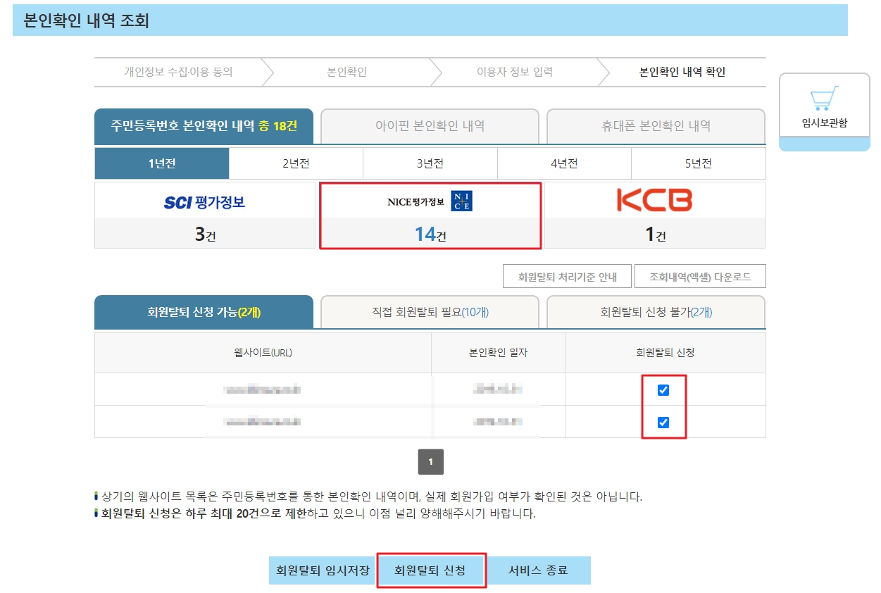 7. 원하는 기관을 선택 하고 아래 회원 탈퇴 신청하고 싶은 사이트를 체크한 후에 회원 탈퇴 신청 하기
