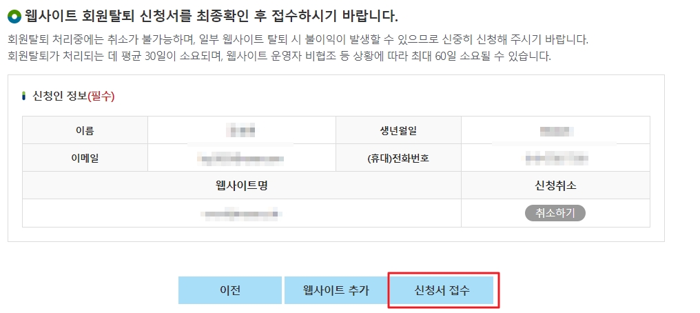 ※ 하루 최대 5건까지 탈퇴 신청 가능, 탈퇴 처리는 평균 30일 소요, 탈퇴 처리 결과는 신청인의 이메일로 발송해주며 홈페이지 '회원 탈퇴 처리 결과' 에서도 확인 가능