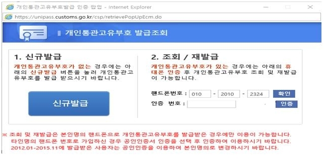 관세청 홈페이지에 휴대폰이나 공인인증서 두개 중 하나로 본인인증을 하시면 됩니다.
