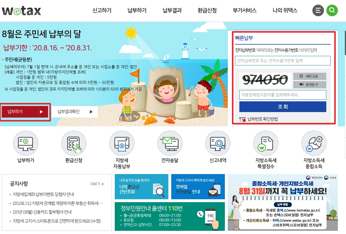 홈페이지에 접속하시면 좌측 납부하기 버튼이나,