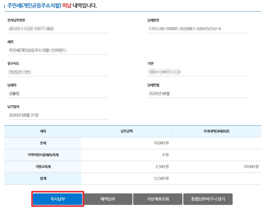 전자납부번호와 보안코드를 입력하고 조회버튼을 클리갛면 아래와 같은 화면이 나옵니다.