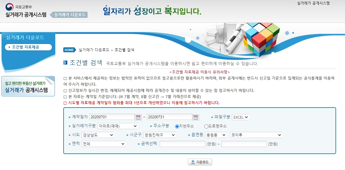 검색한 자료를 엑셀 파일로 저장하고 싶으시면 우측메뉴 중 실거래가 자료제공을 클릭하시면 됩니다.